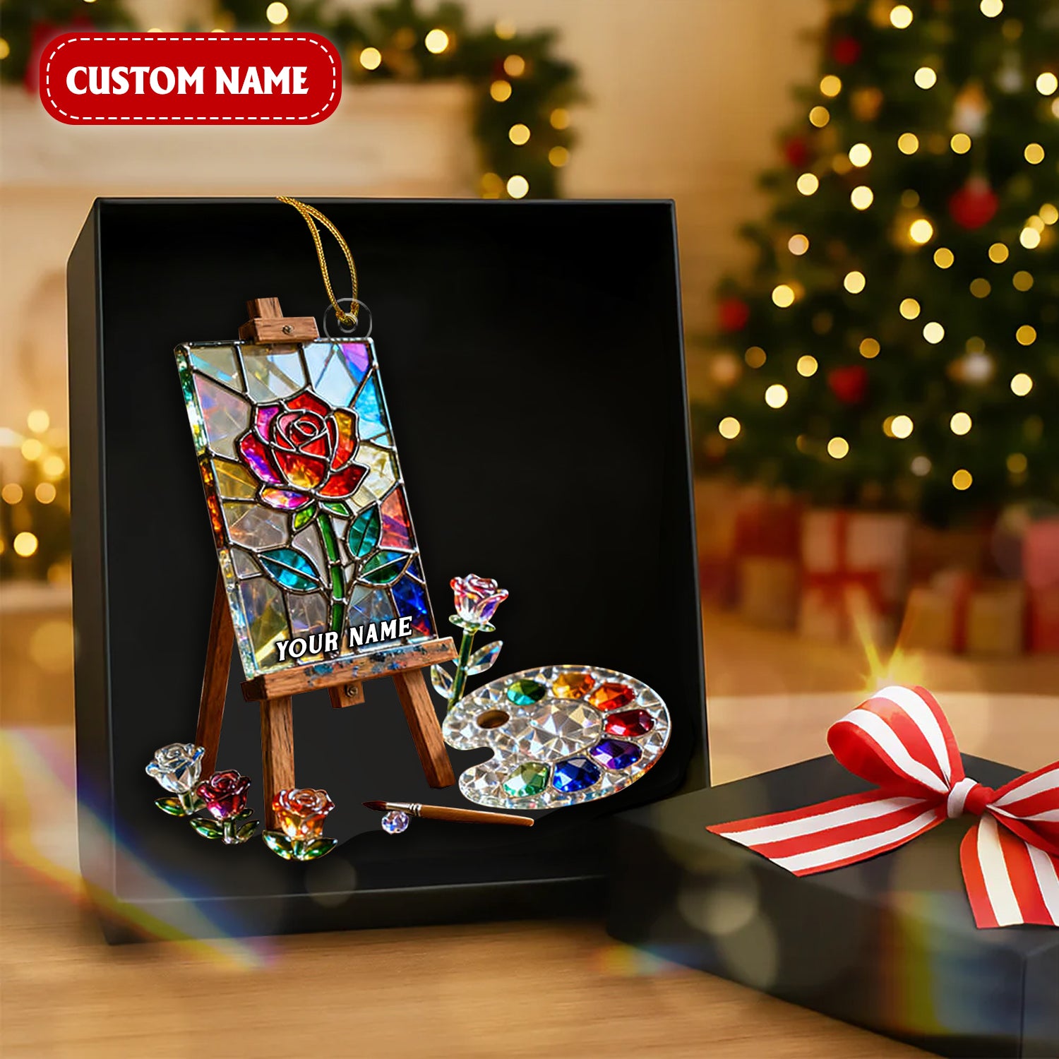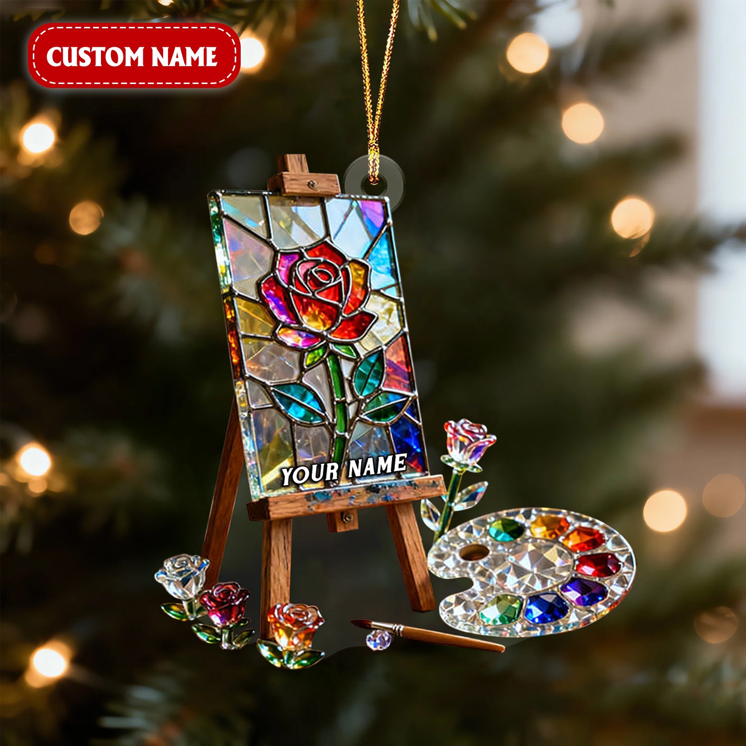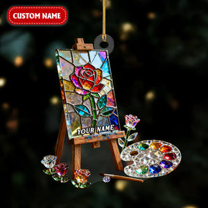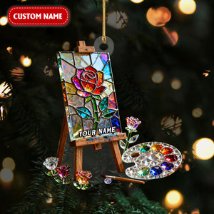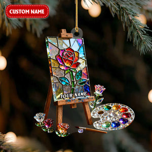 Rose Art Easel Stand Custom Name Stained Glass Effect Acrylic Ornament, Xmas Decor, Artist Christmas Ornament
