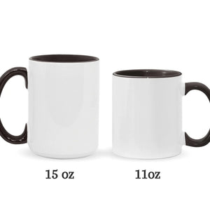 - High quality ceramic mug with two-tone rim, interior, & handle