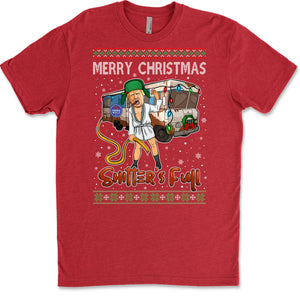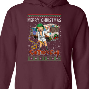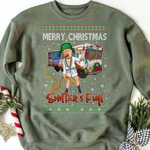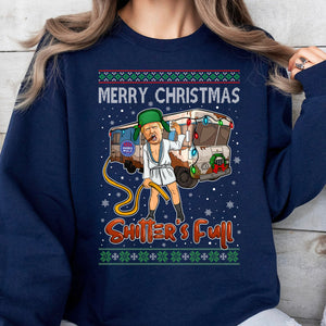 This Christmas-themed sweatshirt features a humorous design inspired by the iconic "National Lampoon's Christmas Vacation" movie scene, with a twist. The central character resembles Donald Trump, dressed in a white robe, green hat, and boots, holding a yellow hose with a comical expression. Behind him is a festive RV decorated with Christmas lights, snowflakes, and other holiday details, as well as a “Harris-Walz” 2024 bumper sticker. Above the character, the phrase "MERRY CHRISTMAS" is displayed in a knit-style font, while below it is the phrase "Shitter's Full" in bold red letters, creating a funny, irreverent holiday look. The design is framed with classic Christmas sweater patterns at the top and bottom, adding to the festive, retro aesthetic.