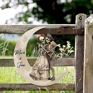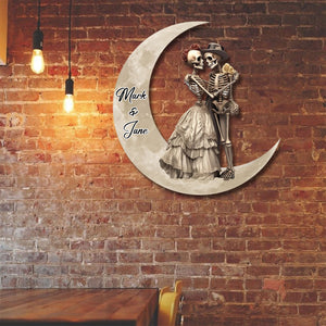 Skull Skeleton Couple on Crescent Moon Custom Valentine Wood Sign