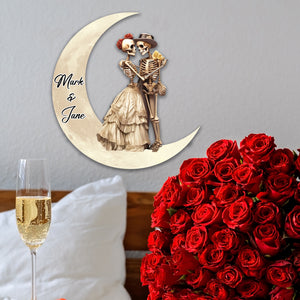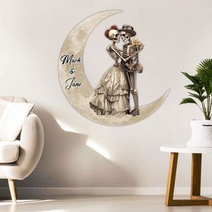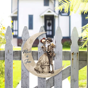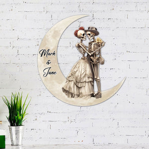 Skull Skeleton Couple On Crescent Moon Personalized Valentine Wood Sign, Halloween Wood Sign, Valentine Gift Ideas
