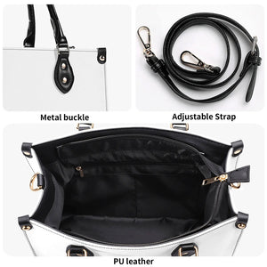 The bag features two handles, a detachable shoulder strap, and a zippered closure. It can be worn as a handbag, shoulder bag, or crossbody bag.