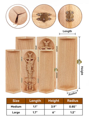 This intricately crafted wooden sculpture is a heartfelt tribute to faith and family. The product features a beautifully designed cylindrical wooden container that opens to reveal a 3D depiction of Jesus Christ on the cross, surrounded by angels and a dove symbolizing the Holy Spirit.