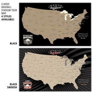 The perfect gift for any baseball fan is our custom vintage weathered Baseball Stadium Tour Map. This unique map showcases the locations of all 30 Major League Baseball stadiums, as well as the Baseball Hall of Fame. Each stadium is marked with a baseball icon to commemorate your visits.