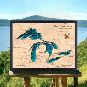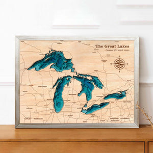 Capture the breathtaking beauty of The Great Lakes with this stunning handcrafted wooden map. Whether it’s Lake Superior, Lake Michigan, Lake Huron, Lake Erie, or Lake Ontario, this unique artwork showcases the intricate topography and depth of these iconic freshwater wonders. Available in two distinct styles to suit your preference: