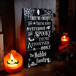 The sign is wooden and is printed in black and white with a popular Halloween Jingle on the front. You can personalise this sign but adding your family name at the bottom.