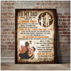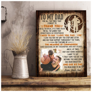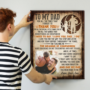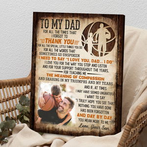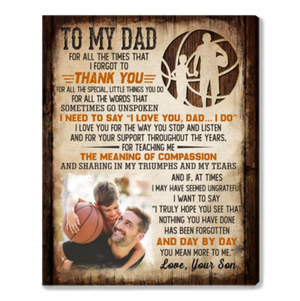 Show your dad just how much he means to you with the "To My Dad You Mean More To Me" Canvas Print Wall Art. This beautifully designed canvas print features a heartfelt message expressing your deep appreciation and love for your dad. Personalize it with a custom photo of a special moment you’ve shared, making it a truly unique and sentimental gift. Perfect for Father's Day, birthdays, or any occasion, this canvas print will make a meaningful addition to his home or office, serving as a daily reminder of your bond.
