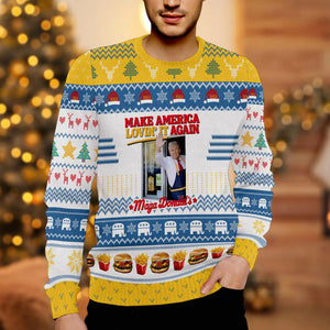 Make Christmas great again with this bold and festive "Trump2024 Make Christmas Great Again" Ugly Christmas Sweater! Featuring a patriotic Santa Claus, this sweater blends Christmas cheer with a fun, political twist, perfect for showing off your holiday spirit and support for the 2024 campaign. Whether you're attending an ugly sweater party, celebrating with family, or looking for the perfect Christmas gift, this sweater guarantees laughter and holiday joy.