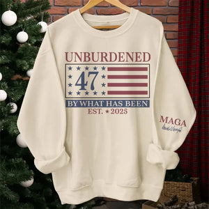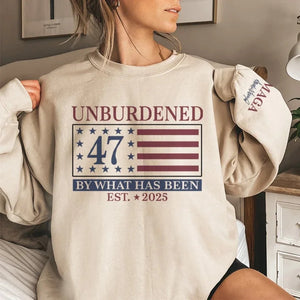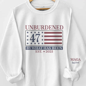 Unburdened 47 US Elections Unisex Sweatshirt With Design On Sleeve, Trump Shirt, Patriot Gift