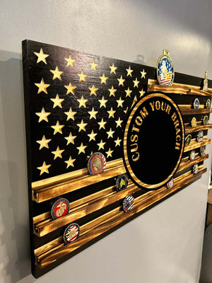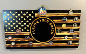 United States Air Force (USAF) Coin Holder Display Flag. The flag is made of pine wood, are available in three sizes and has 6 rows of coin holders. The flag is lacquered with multiple coats for a beautiful shiny finish. This is a beautiful way to display your coin collection. Wall hanging hardware is included.