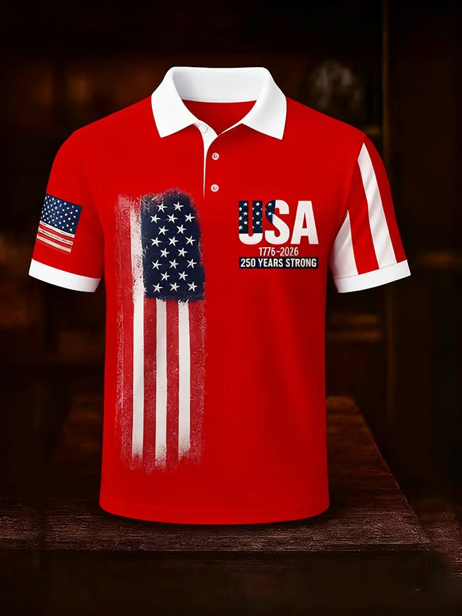 USA 1776-2026 250 Years Strong American Flag Pattern Red Retro Polo Shirts, 4th Of July Polo