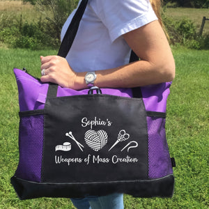 The tote features a delightful design with the quote "Weapons Of Mass Creation" capturing the spirit of yarn lovers everywhere. The bag also includes multiple pockets and compartments to keep your supplies organized and easily accessible.