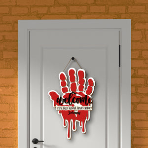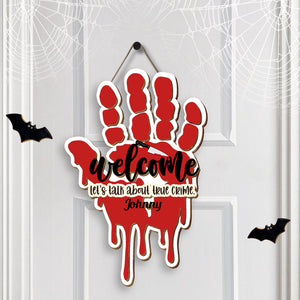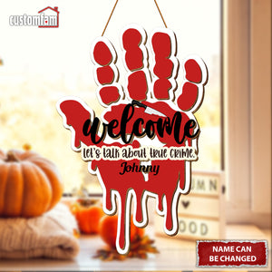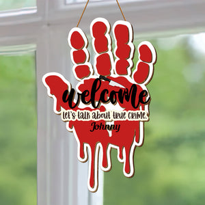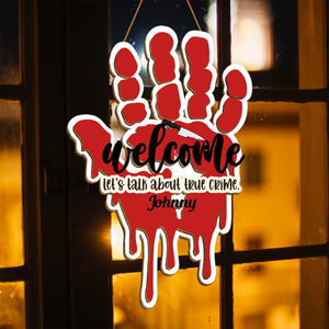 Welcome Let's Talk About True Crime Personalized 2 Layered Hand Horror Door Sign, Halloween Decor
