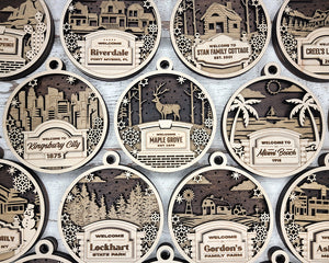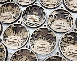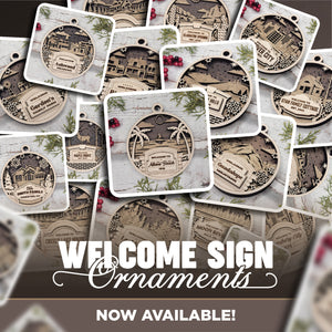 Introducing our Welcome Sign Ornament Bundle, a perfect addition to your holiday decor. This unique set features 17 beautifully crafted ornaments, each depicting a different landscape or iconic place, such as serene lakes, majestic mountains, charming small towns, and bustling cities. Every ornament can be personalized to reflect a specific location, making them ideal for personal use, gifts or selling at markets and shows. Capture the essence of your favorite places and bring a touch of customized charm to your festive season or retail offerings with these exquisite, customizable Welcome Sign Ornaments.