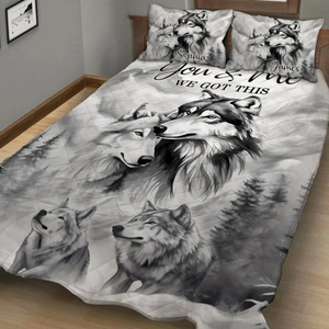 Celebrate your unbreakable bond with our "You and Me, We Got This" Black and White Wolf Couple Quilt Bed Set. Featuring a striking design of a wolf couple in black and white, this bedding set symbolizes loyalty, strength, and love that endures through all challenges.