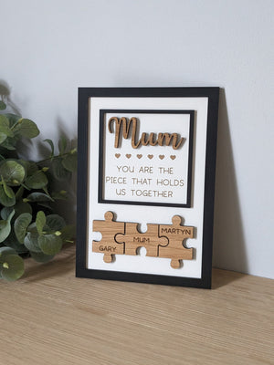 Show your love and appreciation with this custom engraved 2-layer wooden plaque, featuring a heartwarming message: "You Are The Piece That Holds Us Together." Designed to symbolize the unbreakable bond of family, this beautifully crafted plaque makes a perfect keepsake for Mother’s Day, birthdays, or any special occasion.