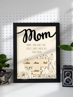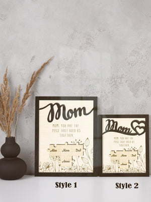 Crafted with care and attention to detail, this personalized wooden sign is more than just décor; it's a symbol of love, connection, and appreciation. Engraved with the heartfelt message "You Are The Piece That Holds Us Together," it serves as a daily reminder of the vital role Mom plays in the family dynamic.