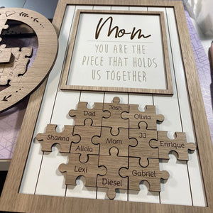 Each piece of this beautifully designed sign represents a member of the family, with the central piece featuring a heartfelt message to dad: "You Are the Piece that Holds Us Together." Surrounding this central piece are custom-engraved puzzle pieces, each bearing the name of a beloved family member, symbolizing the unique role they play in the family dynamic.