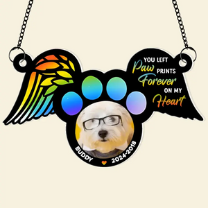 Honor the memory of your beloved pet with our You Left Paw Prints On My Heart Suncatcher Ornament. This heartfelt suncatcher features a beautiful design that captures the love and bond you shared with your furry companion. Perfect for any pet owner grieving the loss of their dog, this ornament serves as a touching reminder of the paw prints they left on your heart. Whether hung in a window or displayed on a tree, the sunlight will cast a beautiful, reflective glow, symbolizing the lasting presence of your cherished pet. A perfect pet memorial gift for dog lovers and a thoughtful dog remembrance gift.
